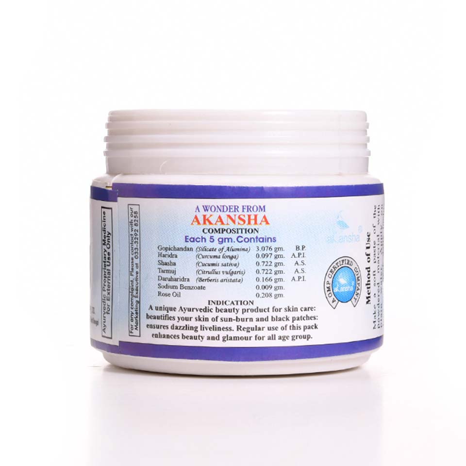 A unique Ayurvedic product for skin care. Beautifies your skin of sun burn and black patches. Ensures dazzling liveliness. Regular use of this pack enhances beauty and glamour for all age group.
