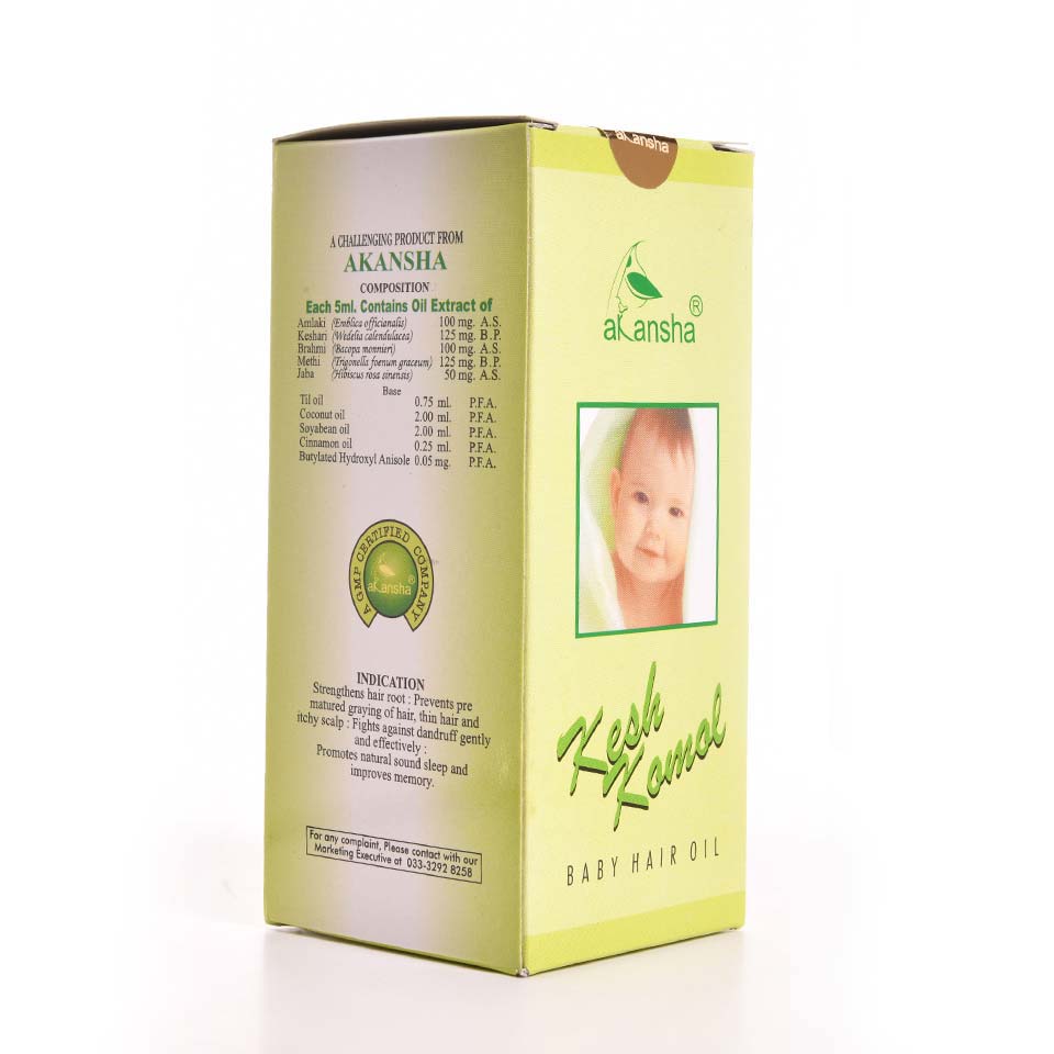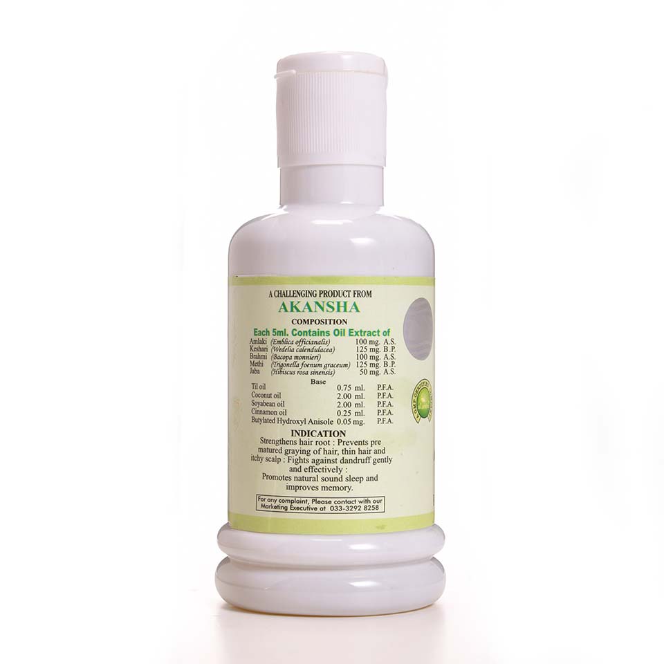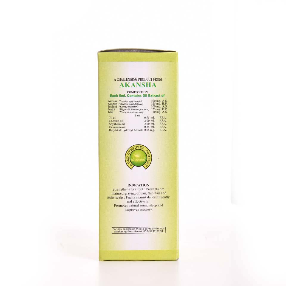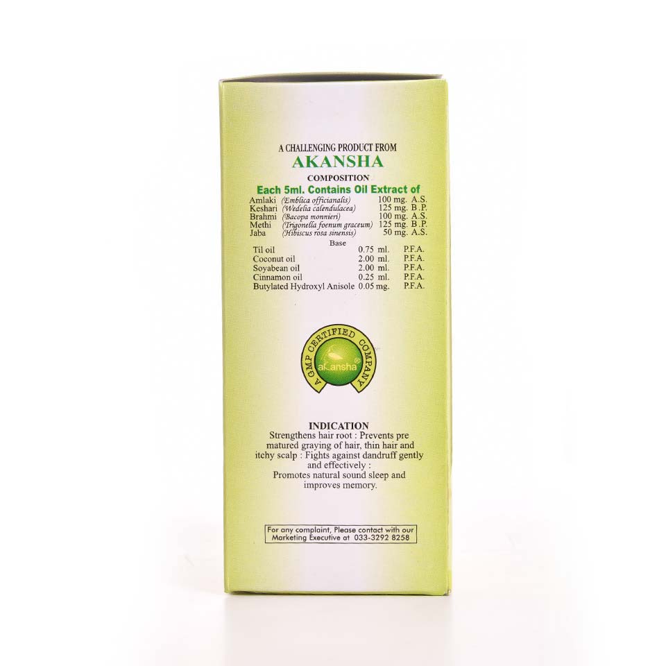 Amlaki(Emblica officianalis), Keshari(Wedelia calendulacea), Brahmi(Bacopa monnieri), Methi(Trigonella foenum graceum), Jaba(hibiscus rosa sinensis), Til oil(Seasamum indicum), Coconut oil(Cocos mucifera), Soyabean oil(Soja max), Cinnamon oil, Butylated Hydroxyl Anisole